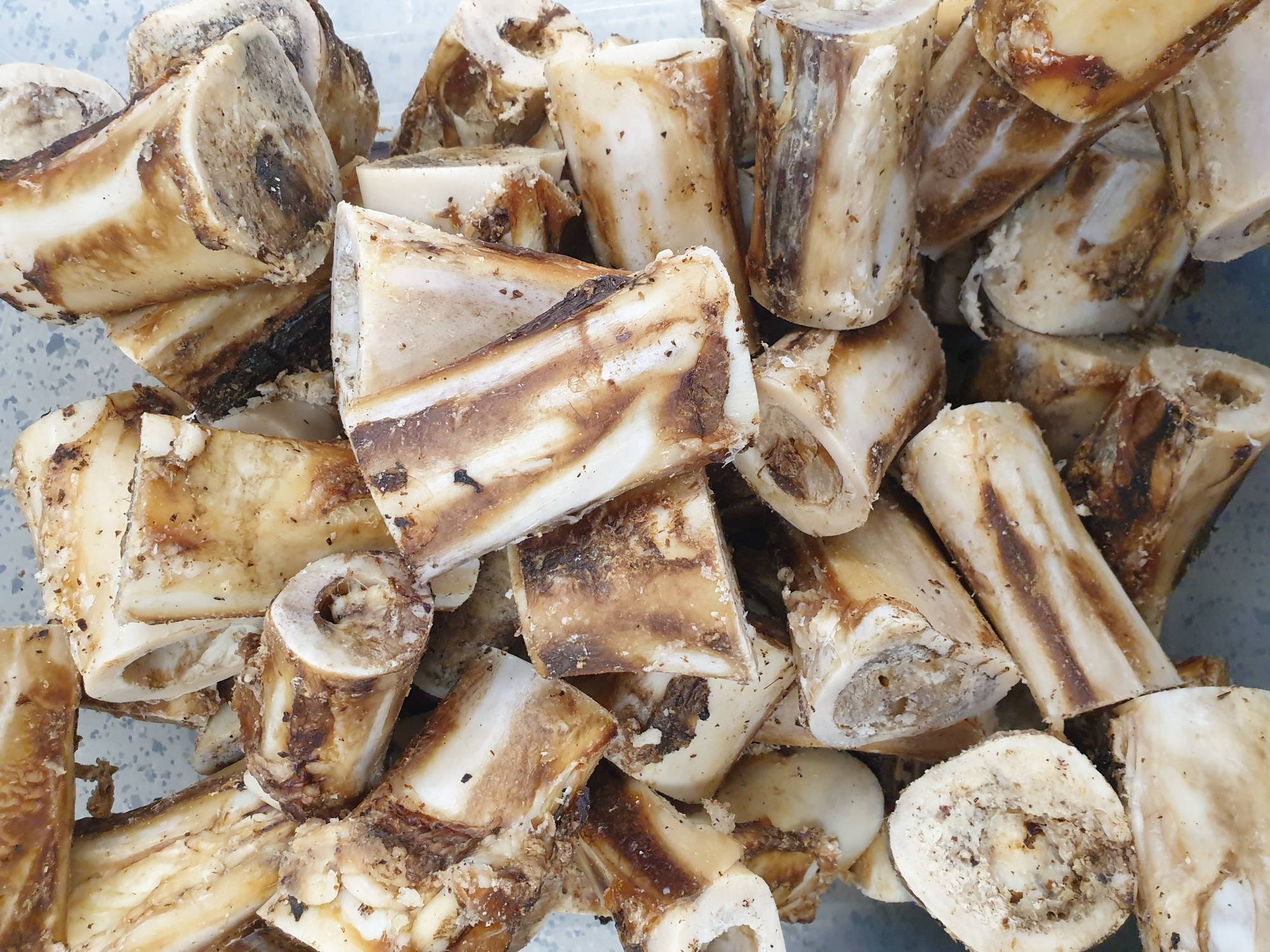 Getrockener Rinderrohrknochen. In für kleine Hunde geeignete Stücke geschnitten.