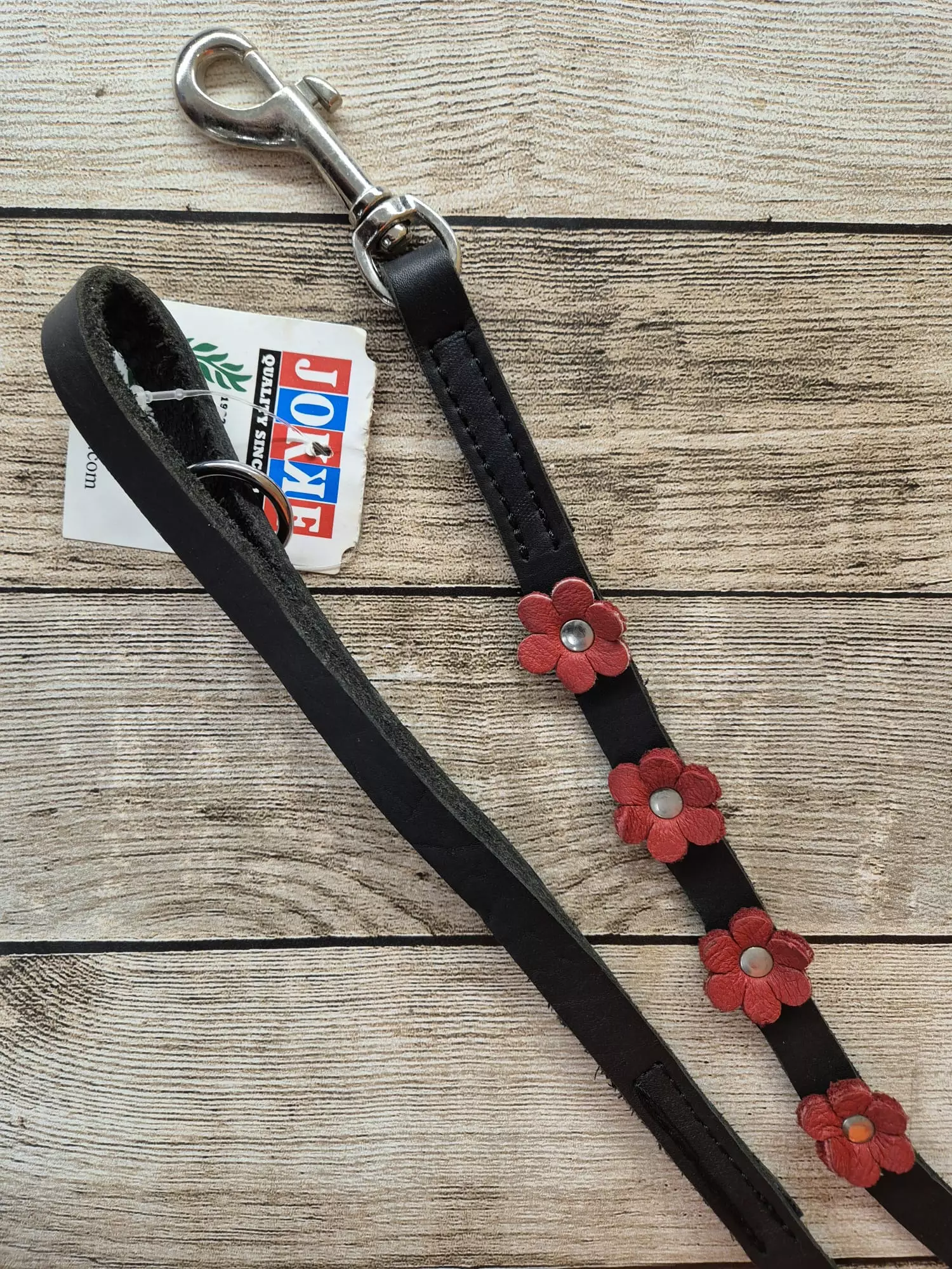 Lederleine mit Blumenverzierungen. Die Leinenfarbe ist Schwarz, die Lederblumen sind Rot. Breite 14mm Länge 180cm