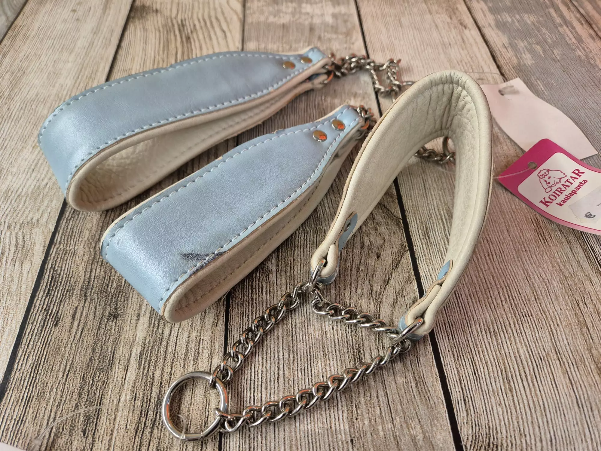 Schwedisches Koiratar Lederhalsband mit Kette. Das halbverstellbare Halsband ist mit Ziernieten versehen. Farbe hellblau. Die Breite des Halsbandes beträgt etwa 4,5 cm. Die Größe ist entsprechend... Mehr lesen