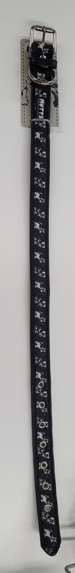 Mutts, die Cartoon-Figuren auf einem 66 cm langen Kunstlederhalsband. Hintergrundfarbe schwarz und Muster weiß.