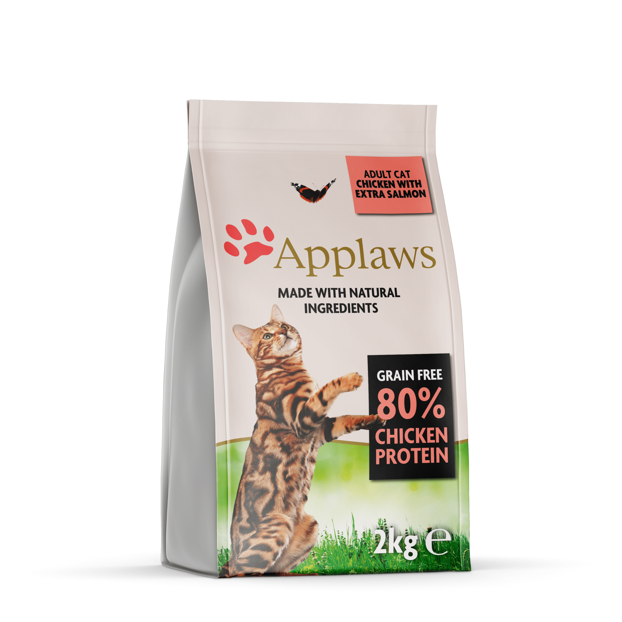 Applaws Adult Chicken & Salmon Dry Cat Food is a grain-free diet formulated for adult cats. Its high meat content makes it extremely palatable. Composition: Dried chicken (50%), dried salmon (13%), chicken meat (13%), potato, freshly prepared salmon (6%), sugar beet, brewer's yeast, salmon oil (1% Omega-3 source), chicken broth (1%), fish broth (0.5%), vitamins and minerals, egg, vegetable cellulose (0.03%), sodium chloride, calcium carbonate, seaweed, cranberry, DL-methionine, potassium chloride, Yucca extract, citrus extract, rosemary extract. Additives per kg: Nutritional additives: Vitamins: Vitamin A (retinyl acetate) 27,850 IU/kg, Vitamin D3 (cholecalciferol) 1,200 IU/kg, Vitamin E (alpha-tocopherol acetate) 615 IU/kg. Trace elements: Selenium from sodium selenite 0.13 mg/kg, iodine from anhydrous calcium iodate 1.5 mg/kg, iron from iron(II) sulfate monohydrate 80 mg/kg, copper from copper(II) sulfate pentahydrate 48 mg/kg, manganese from manganese(II) sulfate monohydrate 38 mg/kg, zinc from zinc sulfate monohydrate 130 mg/kg. Technical additives: E1705 Enterococcus faecium cernelle 68 (SF68, NCIMB 10415) 1,000,000,000 cfu/kg, used to establish, maintain, and restore a balanced gut flora in cats. Natural antioxidants: Mixed tocopherols. Nutritional composition: Protein 37%, Oils and fats 20%, Crude fiber 2%, Ash 10.8%, Calcium 2.8%, Phosphorus 1.6%, Omega 6: 3.5%, Omega 3: 1.4%, Taurine 2000 mg/kg.