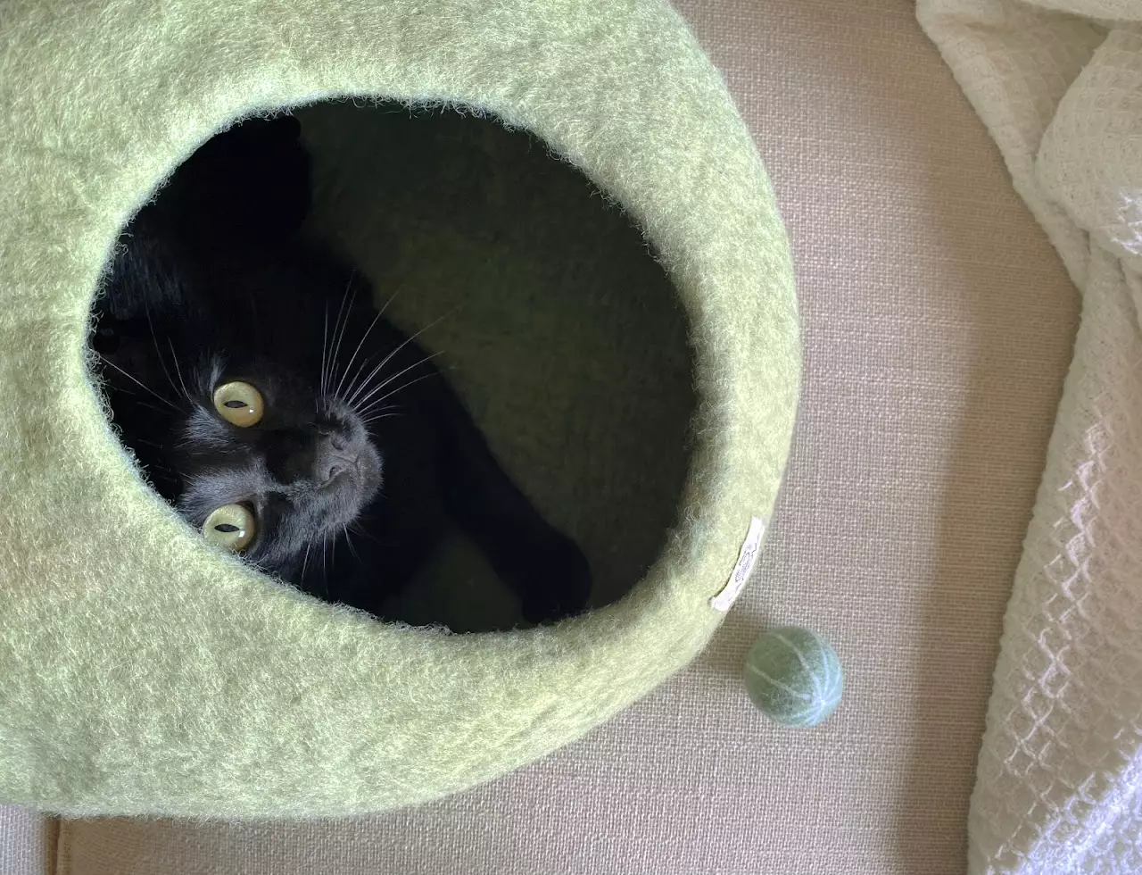 Cat Wool Cave – A Peaceful Hideaway and Observation Point The cave-like design makes this cat wool cave a perfect peaceful hideaway and an excellent observation point. Both small and large cats feel secure in this space designed for them. The natural properties of wool make the cave easy to care for, hygienic, and antibacterial. In addition to its oval shape, the product can also be flattened and used as an open bed. Features and Specifications Entrance Diameter: Ø6.3 in (16 cm) Cave Dimensions: Length 17.7 in (45 cm) × Width 15.7 in (40 cm) × Height 11.8 in (30 cm) Weight: 3.3 lbs (1.5 kg) Material 100% pure and natural New Zealand wool. Special Features Hypoallergenic Odorless Repels dirt and stains Care Instructions Vacuum or use a lint remover for regular cleaning Wipe stains with a damp cloth For wrinkle removal, use a steamer If machine washing is necessary, use the wool program without spinning. Reshape when damp and allow to dry in a ventilated area Note Sizes are approximate, as each cat cave is handmade.