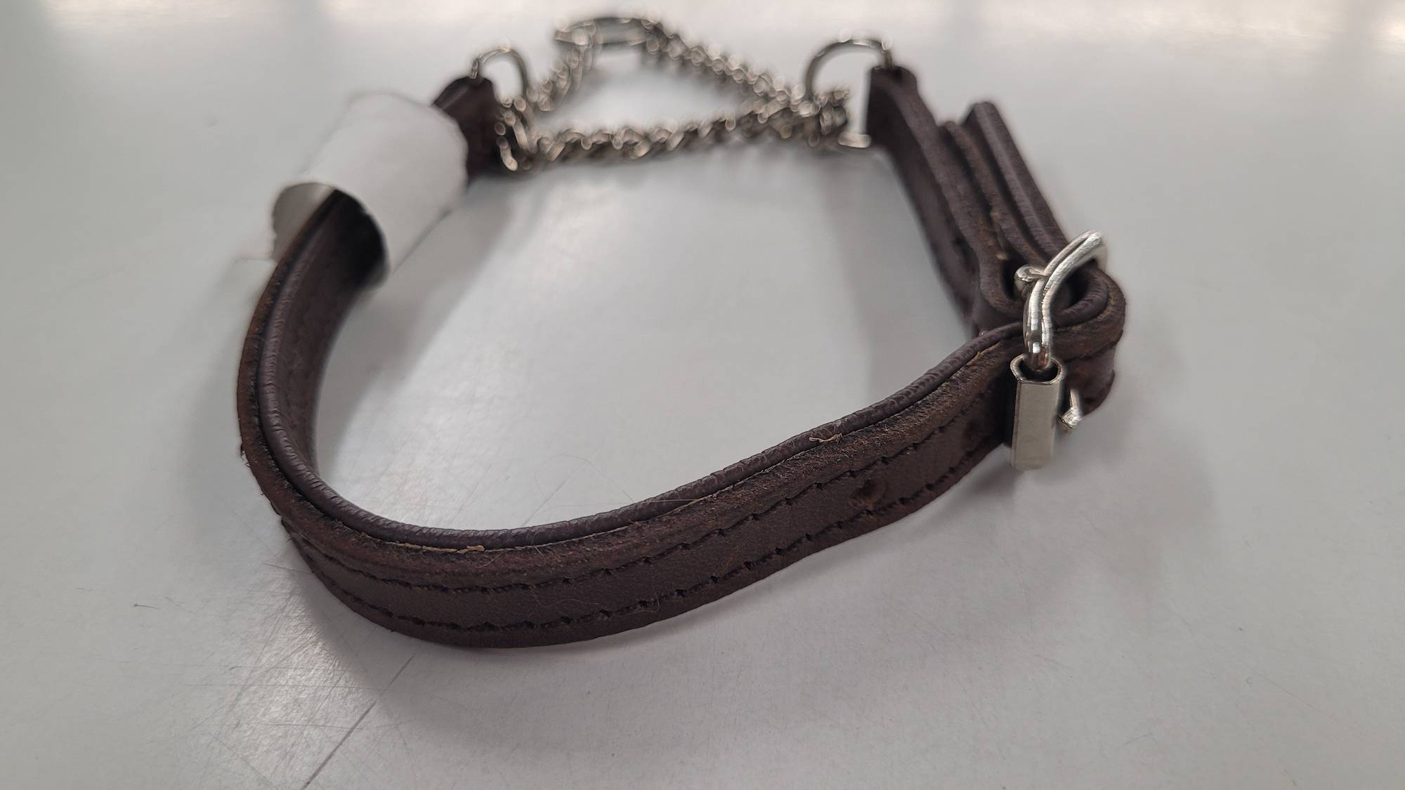 HOL11 Brown, adjustable length from approximately 30-35 cm (11.8-13.8 in). The chain adds approximately 12 cm (4.7 in) of extra length, making it easier to put on your pet. HOL111 Black, adjustable length from approximately 25-30 cm (9.8-11.8 in). The chain adds approximately 11 cm (4.3 in) of extra length, making it easier to put on your pet. The leather shows some wear from age but remains functional.
