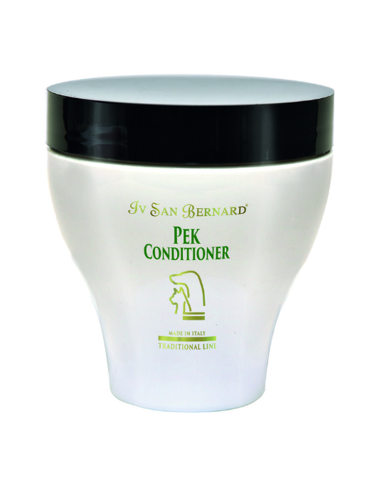 A conditioning product designed to care for fur and detangle difficult mats. Its formula adds elasticity and smoothness to the coat while restoring its natural moisture balance. Usage Instructions: After shampooing, apply an adequate amount of conditioner to the coat and allow it to work for about 3 minutes. Brush or comb the coat and rinse thoroughly with warm water. For show preparation: After a normal wash and the application of conditioner, mix a small amount of conditioner with warm water and massage well into the coat, or use a spray bottle for application. Dry the coat without rinsing. Brush evenly during drying until the conditioner has been absorbed. Tip: Mix the Pek conditioner into your Iv San Bernard conditioner (such as Lemon, Banana, or Green Apple) to prevent matting. Pek seals the individual hair's cuticles, making the hair smoother and stronger. It prevents dirt from penetrating too deeply into the hair and maintains moisture balance. The Pek conditioner is incredibly versatile! In addition to regular use, to facilitate mat removal, you can mix a small drop of hot water with the Pek conditioner and apply it as a pre-treatment to dry fur before washing. Allow it to work for up to 30-60 minutes to make mat removal easier. You can even turn it into a grooming spray: mix 1 teaspoon of Pek conditioner with half a liter of hot water. Allow it to cool, and you can spray the grooming solution onto the coat while drying or brushing. Especially for medium-length coats: spray on areas where you want added volume before drying. Contents (Safe Pet Cosmetics certified): AQUA (WATER), CETEARYL ALCOHOL, CETRIMONIUM CHLORIDE, IMIDAZOLIDINYL UREA, PARFUM, PHENOXYETHANOL, PROPYLENE GLYCOL, METHYLPARABEN, ETHYLPARABEN, CITRIC ACID, AMYL CINNAMAL, BUTYLPHENYL METHYLPROPIONAL, BENZYL SALICYLATE, PROPYLPARABEN, BUTYLPARABEN, CI 19140 (YELLOW 5), CI 42051, CI 47005 (YELLOW 10), OLEA EUROPAEA (OLIVE) FRUIT OIL, MEL EXTRACT, CI 28440.