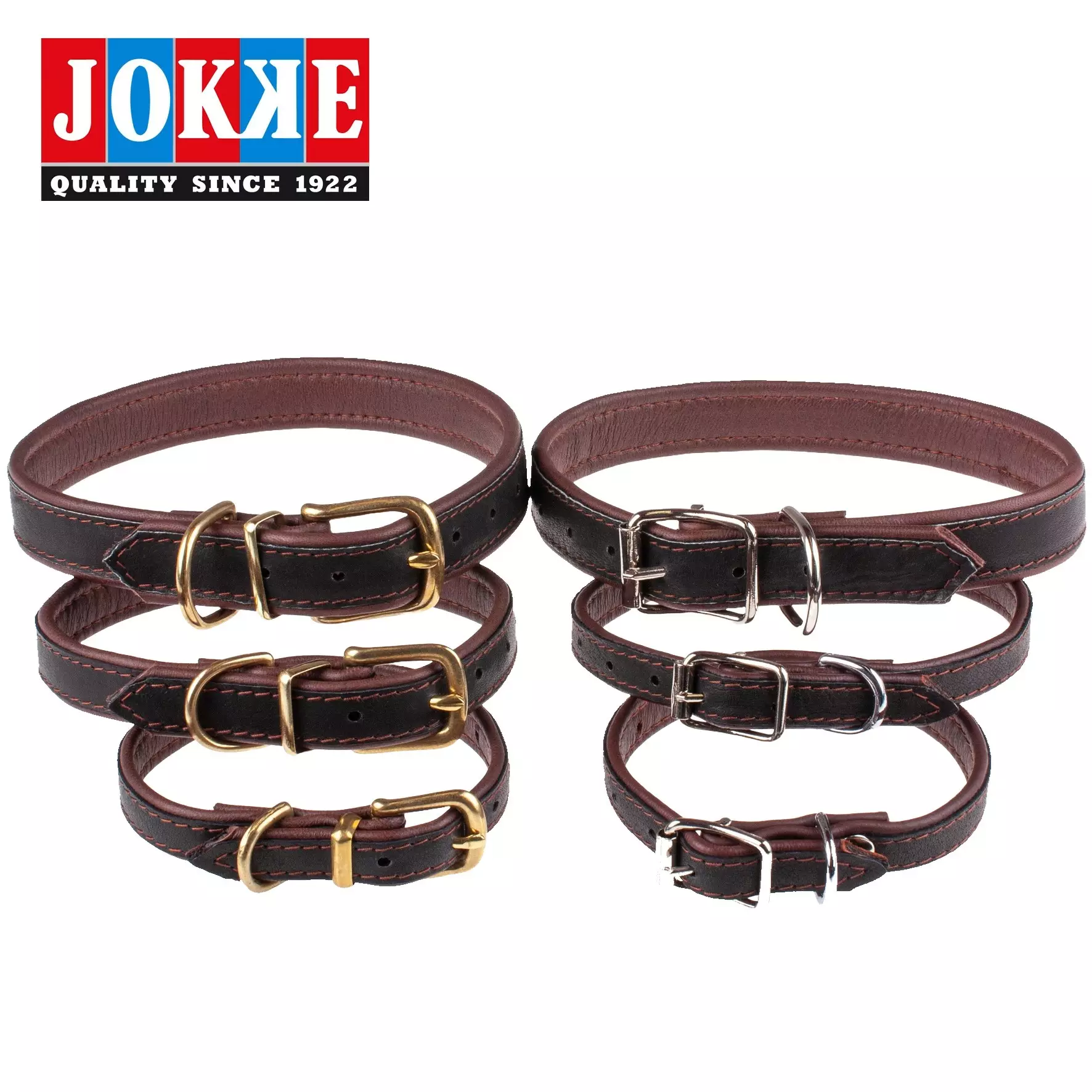 Jokke black leather collar with brown lining.The collar length refers to the total length of the collar.Adjustable sizes according to dimensions: 34 cm: approx. 8.3-12.6 in, width 0.6 in.40 cm: approx. 10-13 in, width 0.6 in.45 cm: approx. 13-15.4 in, width 0.8 in.50 cm: approx. 14-17.9 in, width 0.8 in.53.5 cm: approx. 15.2-19.1 in, width 1 in (the reinforcement material under the black leather is slightly frayed).60 cm: approx. 17.3-21.3 in, width 1 in.65 cm: approx. 19.7-23.6 in, width 1 in.