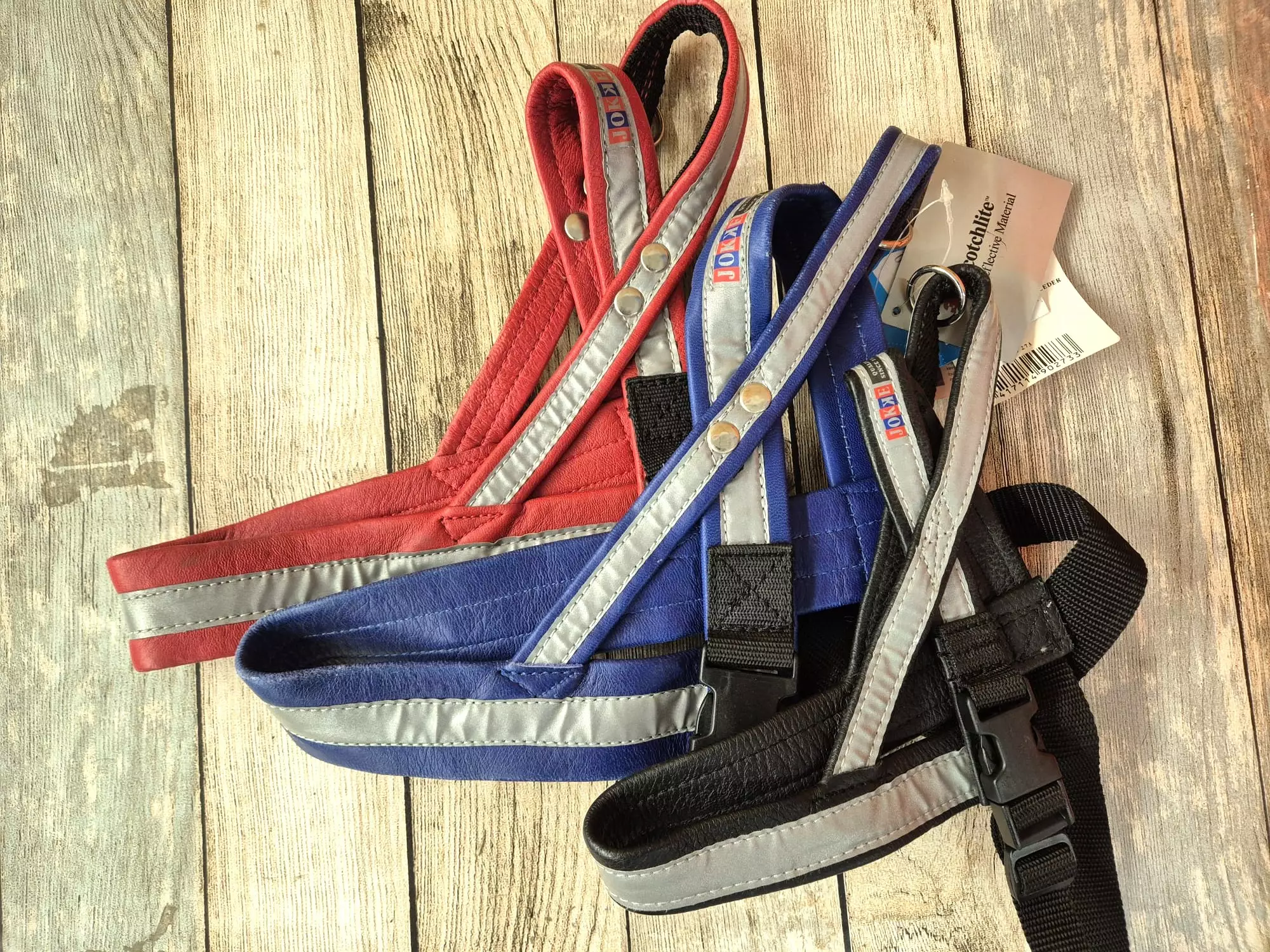 Leather Jokke harness with reflective tape. The size of the T-harness can be adjusted from behind the legs. The harness is easy to put on the dog. The leather harness has a sturdy handle on the back... Read more