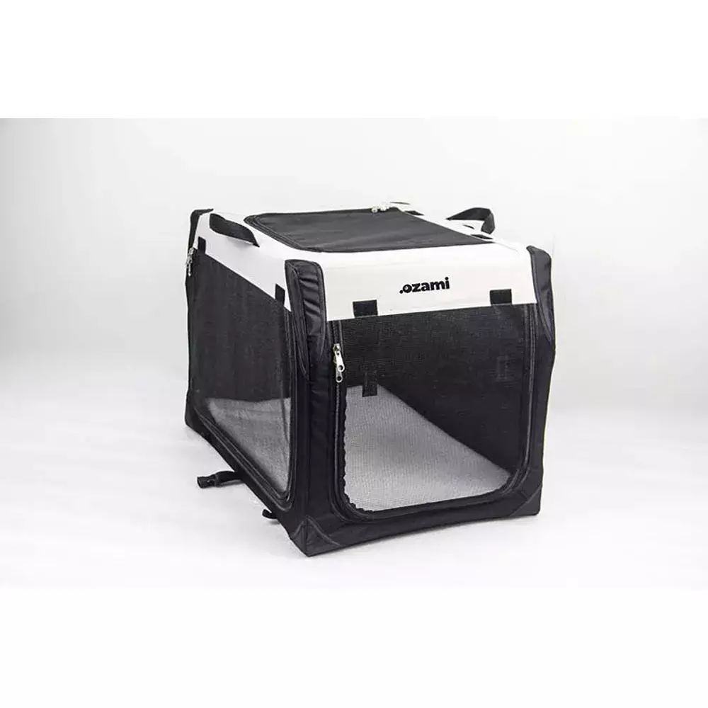 Dog Crate Nylon Black/Gray XXL, dimensions approximately 41.7 x 27.6 x 27.2 inches. - Sturdy dog crate made from durable nylon - Mesh entrances on both the long and short sides - Fastening loops and included tent pegs for easy securing to the ground - Non-slip legs for added stability - Includes a soft mat to ensure comfort Ozami dog crate – a safe and practical choice for indoor and outdoor use. The crate has openings on both the long and short sides, facilitating easy access and ensuring good ventilation. One end features a convenient storage pocket for food, treats, or other accessories. The crate is constructed with a steel frame covered in durable nylon – suitable for heavy use and even active dogs. Non-slip legs and fastening loops provide a secure position, and the included tent pegs allow for easy ground attachment. The product also includes a practical carrying bag with a shoulder strap for easy transport.