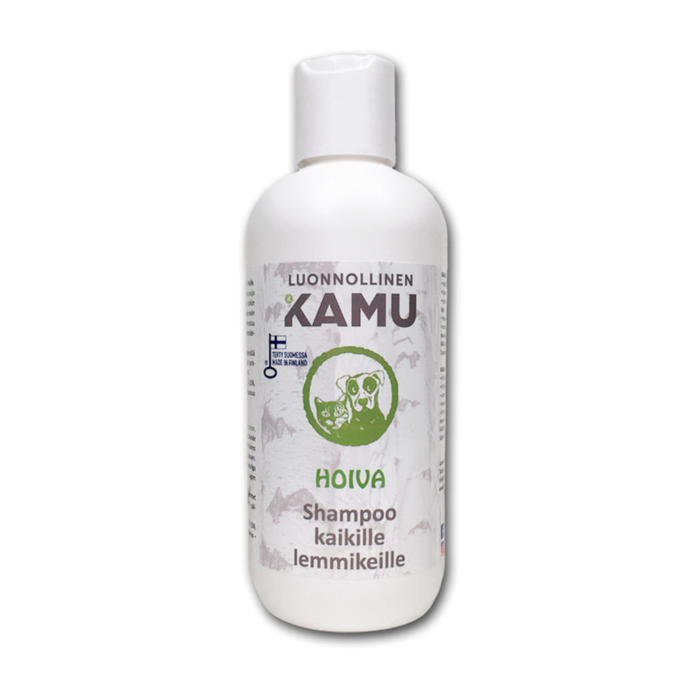 Natural Kamu Care pet shampoo is suitable for a variety of pets, including dogs, cats, guinea pigs, ferrets, and horses. This shampoo is designed to meet the basic needs of various coat types and is excellent for washing medium-length fur. It is also well-suited for frequent washes. The formula is gentle on dry and itchy skin, featuring lemon, lemongrass, and honey to soothe the skin. It cleans the coat while preserving the hair's texture and helps bring out its natural shine. The cleansing power relies on natural olive and coconut-based surfactants. It produces a suitable amount of lather. Kamu pet shampoos are made from natural, plant-based ingredients and are safe for users and the environment. Kamu products are 100% biodegradable.Kamu is proudly produced in Finland and has been awarded the Key Flag symbol. Care shampoo is suitable for many pets:- For both long and short coats- For rough and shiny fur- Lemon and lemongrass are effective odor eliminators- Honey calms sensitive skin- Also suitable for other pets such as cats, guinea pigs, and horses Instructions for use: Wet the coat with warm water. Massage the shampoo evenly into the fur. No dilution is required. Rinse thoroughly.Can be used as is or diluted up to 1:4.INCI: Olivamphoacetate, Sodium Benzoate, Sea Salt, Honey, Cymbopogon citratus Oil, Citrus limon Oil.PH 6.5