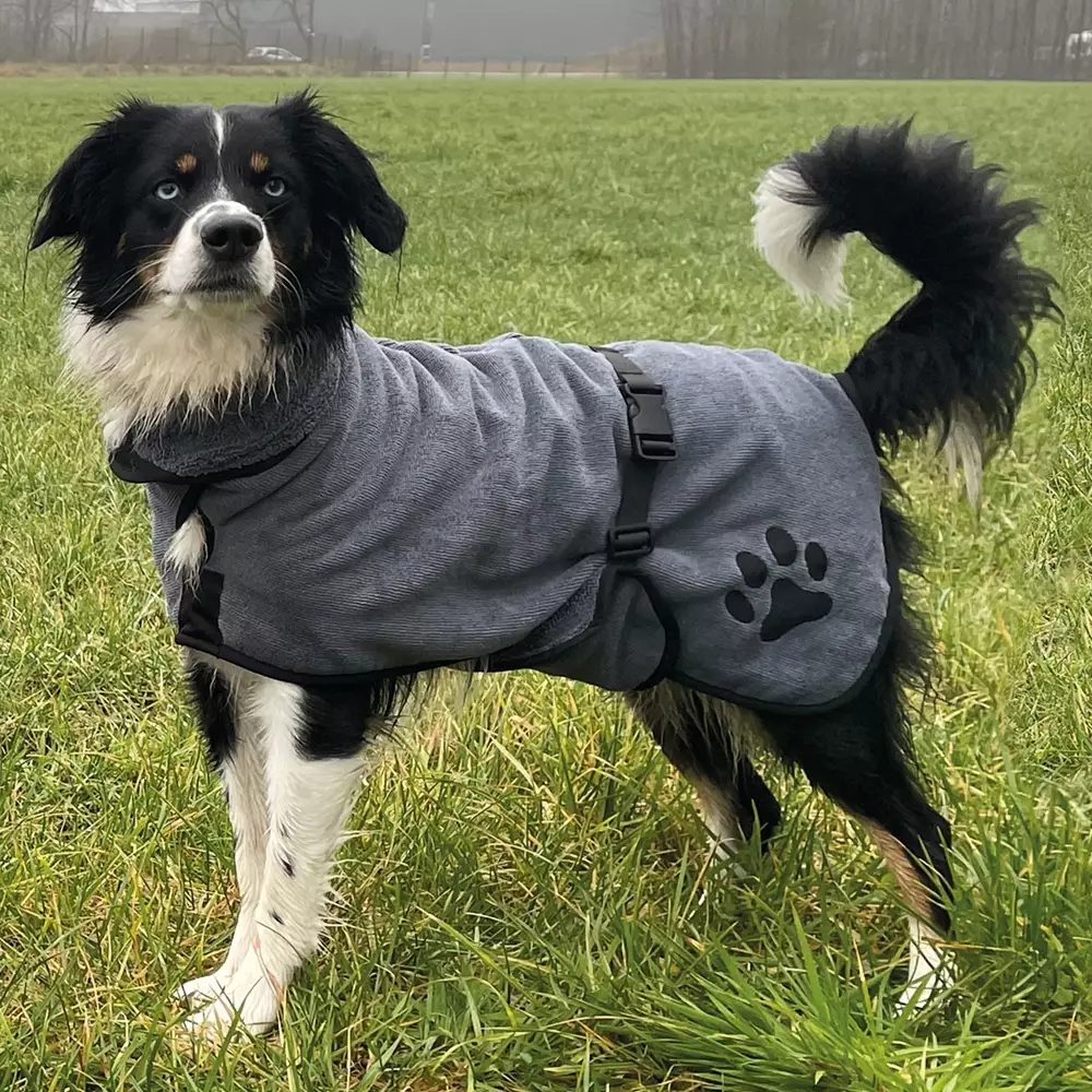 DRY & CLEAN Dog Bathrobe. Give your dog the perfect accessory after a bath, swim, or walk – a microfiber dog bathrobe! This practical robe ensures that your four-legged friend dries quickly and stays warm. The high-quality material absorbs water and dirt instantly, remains odor-free, and is extremely lightweight and quick-drying. Thanks to the wide elastic parts and adjustable belly strap with a snap lock, the robe fits perfectly. The adjustable Velcro closures at the collar allow for a custom fit. Easy to care for and machine washable at 30 degrees Celsius. Size, back length, belly circumference adjustment range XS, 15.75 inches (40 cm), 15.75-26.77 inches (40-68 cm) S, 18.90 inches (48 cm), 17.32-29.13 inches (44-74 cm) M, 22.05 inches (56 cm), 20.47-33.86 inches (52-86 cm) L, 25.20 inches (64 cm), 23.23-37.80 inches (59-96 cm) XL, 28.35 inches (72 cm), 25.98-41.73 inches (66-106 cm) XXL, 31.50 inches (80 cm), 26.77-43.31 inches (68-110 cm)
