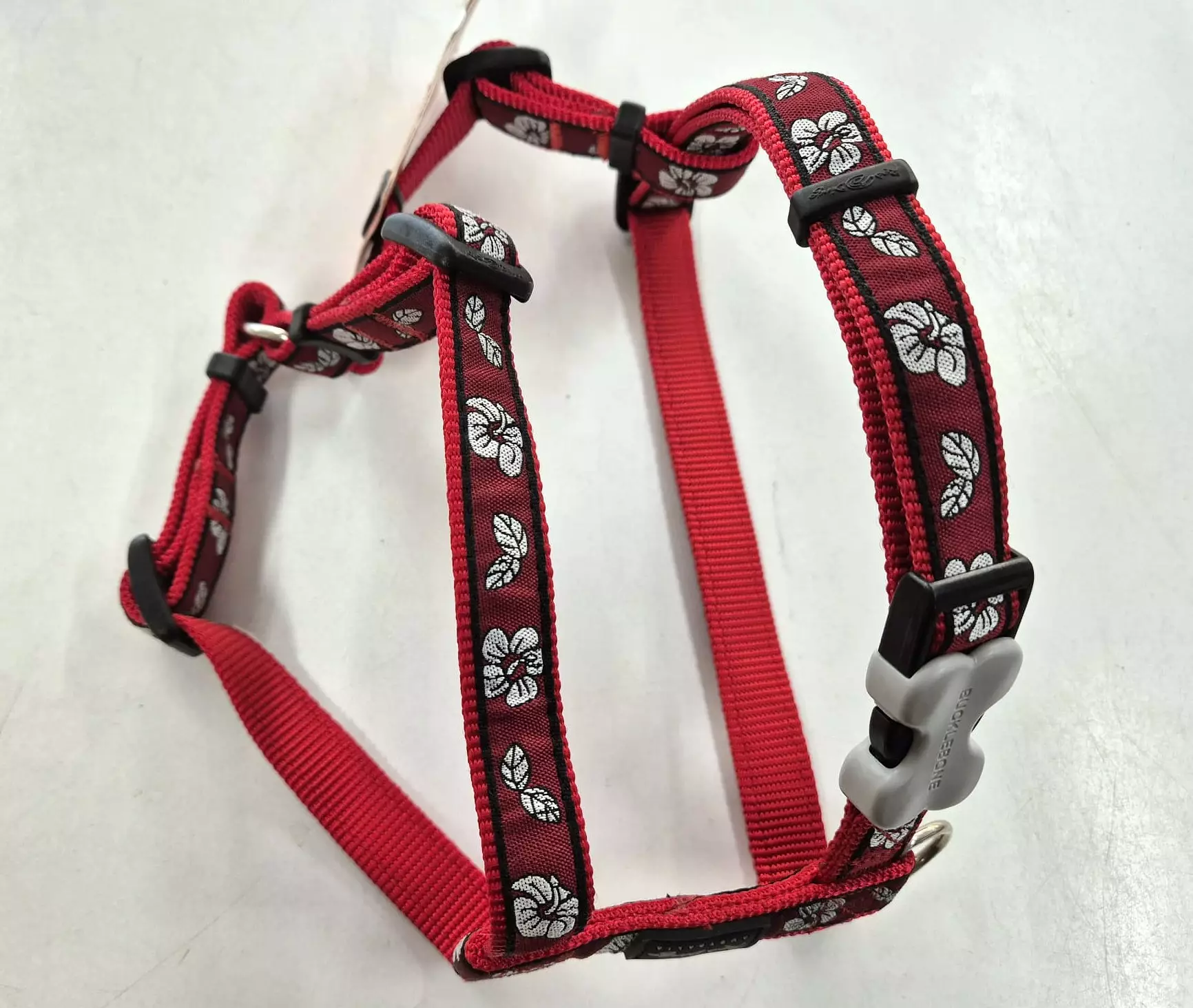 Red Y-Harness with floral pattern.The harness is highly adjustable at the front and back. Measure the neck at the point where the front of the harness will rest. The body measurement should be taken behind the front legs. Sizes:M: Neck 13.8 - 20.9 inches (35-53 cm), Body 15.7 - 26.4 inches (40-67 cm).L: Neck 18.1 - 29.9 inches (46-76 cm), Body 20.9 - 34.3 inches (53-87 cm).XL: Neck 24.4 - 42.9 inches (62-109 cm), Body 27.9 - 49.2 inches (71-125 cm). This is an older model in clearance, so the remaining harnesses are being sold at a discounted price.