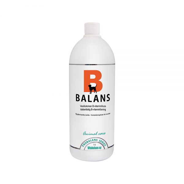 The requirement for vitamin B in dogs increases especially during growth, pregnancy, and periods of intense physical exertion. Vitamin B is essential for brain development, fertility, growth, skeletal development, and nutrient absorption. B-vitamins are easily destroyed by heating, which means that dogs consuming dry food may be at risk of deficiency.This strong B-vitamin solution is suitable for all dogs. B-vitamins support the body's energy metabolism, nervous system, and muscle function. The ratios of B-vitamins in the solution are formulated to meet the vitamin B needs of dogs.• For supplementing dry and raw food• During competition and training periods• For nervous system support• For skin and coat healthAdminister once daily by mixing with food.• 1st dosage level: for dogs under normal stress 0.5 ml/10 kg• 2nd dosage level: for growth, reproduction, and lactation 1 ml/10 kg• 3rd dosage level: for greyhounds and other dogs engaging in very demanding physical performance 1-2 ml/10 kgFollow the dosage instructions. B-Balans is a very concentrated B-vitamin solution. When dosing, consider the amount of vitamins obtained from diet.Also suitable for cats (1 drop/4 kg).1 ml is approximately 22 drops.Shake the bottle before use.B1 (Thiamine) 2 mg/mlB2 (Riboflavin) 5 mg/mlNiacin (B3) 20 mg/mlB5 (Pantothenic Acid) 20 mg/mlB6 (Pyridoxine) 2 mg/mlB12 (Cyanocobalamin) 40 µg/mlBiotin 100 µg/mlCholine 130 mg/mlWater, Additives: choline chloride, nicotinamide, dexpanthenol, pyridoxine hydrochloride, sodium riboflavin-5-phosphate, thiamine hydrochloride, cyanocobalamin, D-biotin, preservatives.Does not contain xylitol.