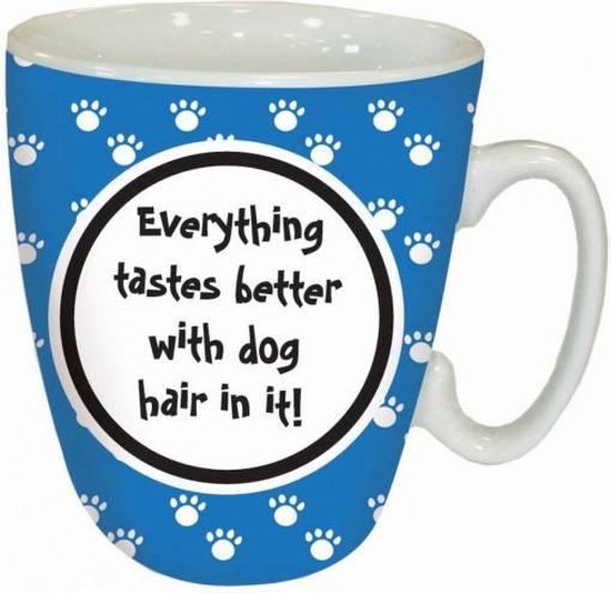 Mug with text ('Everything tastes better with dog hair in it'). 250ml.