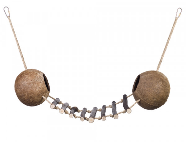 This active toy is made from two coconut shells featuring openings, sisal ropes, and wooden beads, suitable for both birds and small rodents. The toy measures 90 cm in length. Your pet's natural curiosity demands variety and exciting cage accessories. This interactive toy is crafted from natural materials and is easy to attach to the cage.