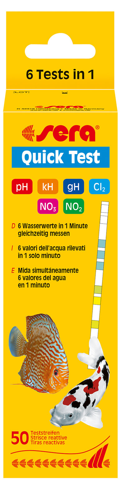 Vattenprov för samtidig mätning av pH-, GH-, KH-, NO2- och NO3-värden på under en minut. Innehåller 50 teststickor. Teststicka. Stickan innehåller följande tester: pH – surhetsgrad GH – total hårdhet KH – karbonathårdhet NO2 – nitrit NO3 – nitrat CL2 – klor