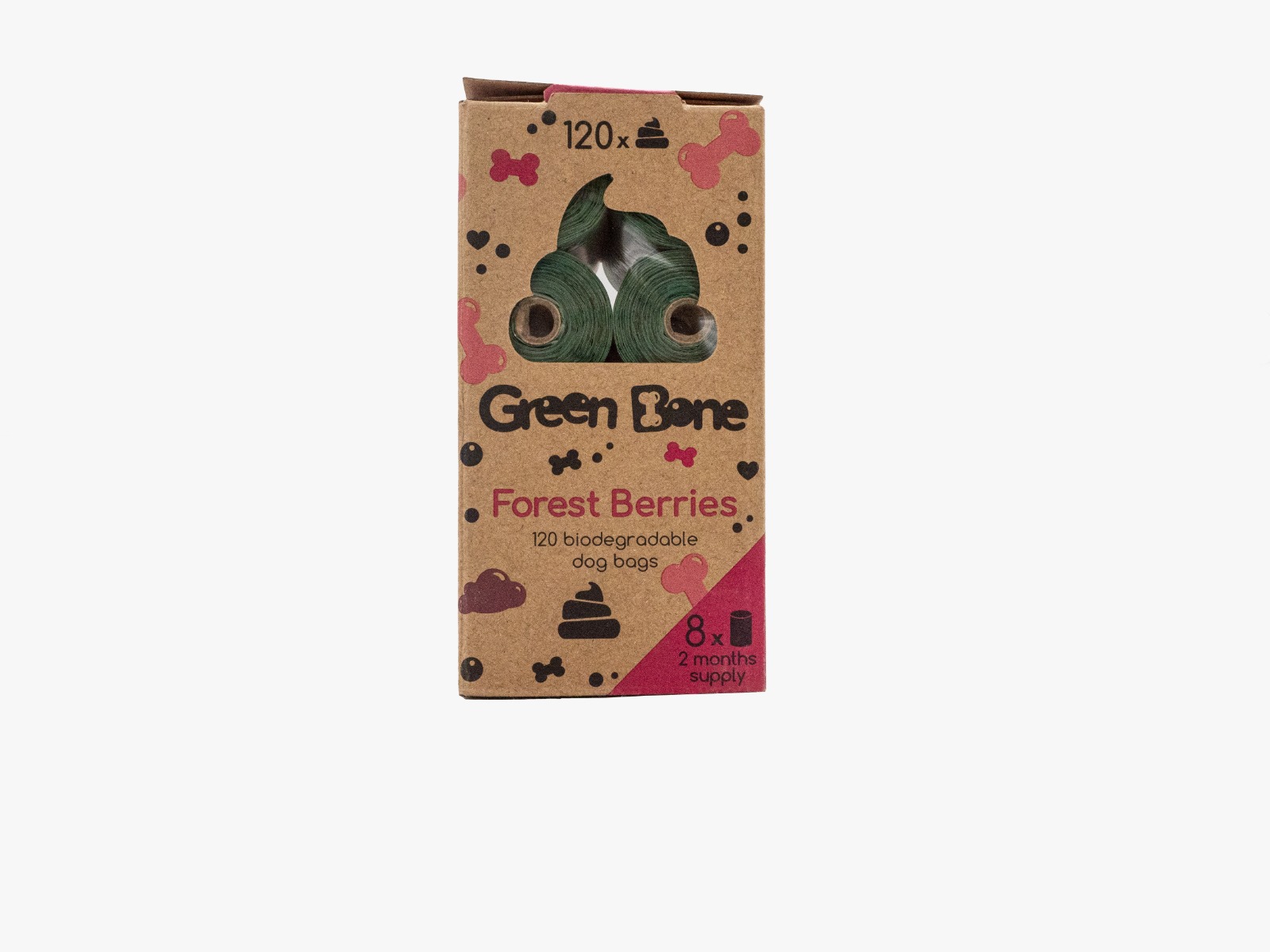Green Bone hundbajspåsar för miljömedvetna konsumenter. Förpackningarna och rullen är tillverkade av återvunnet material. Green Bone hundbajspåsar är tillverkade av EPI-plast, som bryts ner på cirka 24 månader. Denna låda innehåller 8 rullar med totalt 120 hundbajspåsar. Påsarna har en doft inspirerad av skogs- och bär.