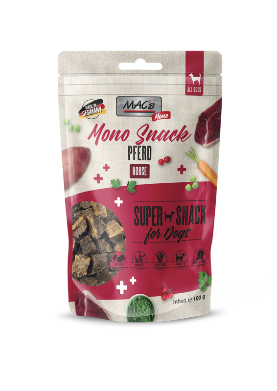 MAC’s SNACKS MONO häst har utvecklats särskilt för känsliga hundar.Endast en källa av animaliskt protein, vilket gör den idealisk för allergiker.Tillsammans med MAC’s MONO våtfoder och MAC’s MONO torrfoder bildar denna delikatess ett näringsmässigt balanserat koncept – perfekt för eliminationsdiet! Tillverkningsingredienser: Häst 65%, torkat hästprotein 15%, sötpotatis, morot, ärtor, magnesiumpropionat, äppelpuré, spirulina, aronia, tranbär, persilja, natriumklorid. Näringstillskott: Antioxidant (E-vitamin) Näringsinnehåll: protein 30%, råfett 11,8%, råfiber 2%, råaska 12%, fukt 25%, Omega3 0,6%, Omega6 0,95%