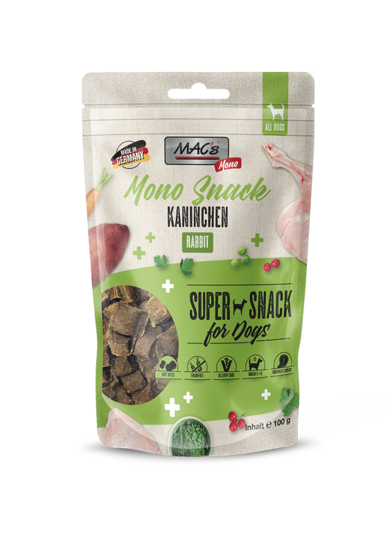 MAC’s SNACKS MONO kanin är särskilt utvecklade för känsliga hundar. Enbart en källa av djurprotein gör dem idealiska för allergiker. Tillsammans med MAC’s MONO blötfoder och MAC’s MONO torrfoder utgör denna godsak en näringsmässigt balanserad helhet – perfekt för eliminationsdiet! Ingredienser: Kanin 65%, torkat kaninprotein 15%, sötpotatis, morot, ärtor, magnesiumpropionat, äppelsäckmassa, spirulina, aronia, tranbär, persilja, natriumklorid. Nutrtionella tillsatser: Antioxidant (E-vitamin) Näringsinnehåll: protein 27%, råfett 14%, råfiber 1,8%, råaska 8,6%, fukt 25%, Omega3 0,12%, Omega6 2,1%