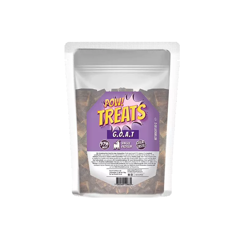 En läcker godbit som innehåller 97 % getkött. Godbitten erbjuder en enda proteinkälla och är full av smak, perfekt för träning, belöningar eller när du bara vill ge något riktigt gott! Innehåll: Färsk getkött 97 %, tapioka 3 %. Analys: Råprotein 67,7 %, råfett 12,8 %, råaska 10,5 %, växtfiber 0,2 %, vatten 7,5 %. Kalorier: 4920 kcal/kg Utfodringsguide: POW-godisar bör ges som en del av en hälsosam kost. Se till att hunden alltid har tillgång till färskt dricksvatten. Förvara svalt och torrt.