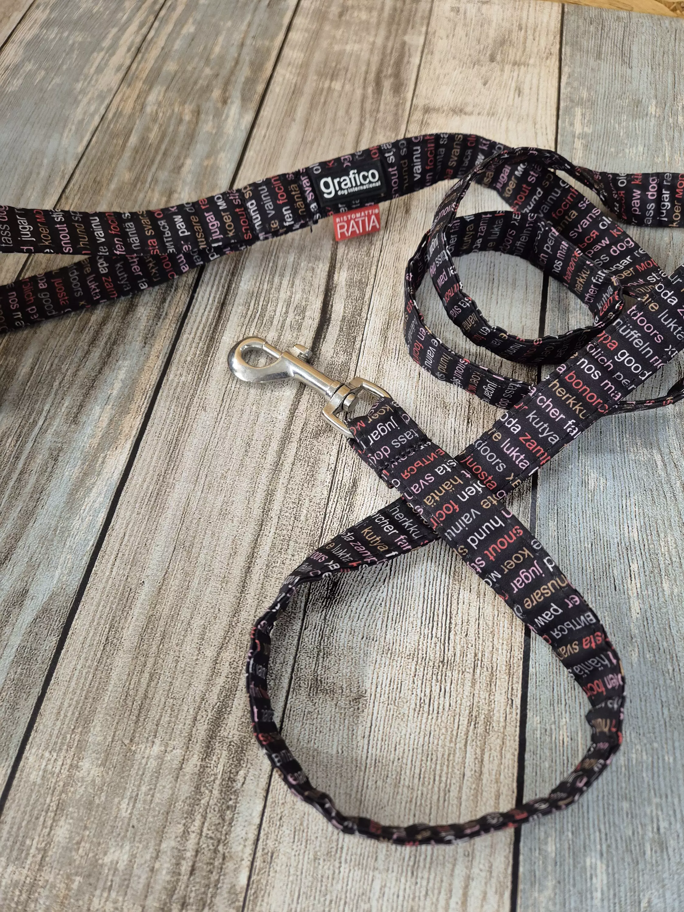Elegant Ratia koppel. Storlek 2-2,5 x 180 cm. Finns i två olika färger: röd-svart eller blå-svart.