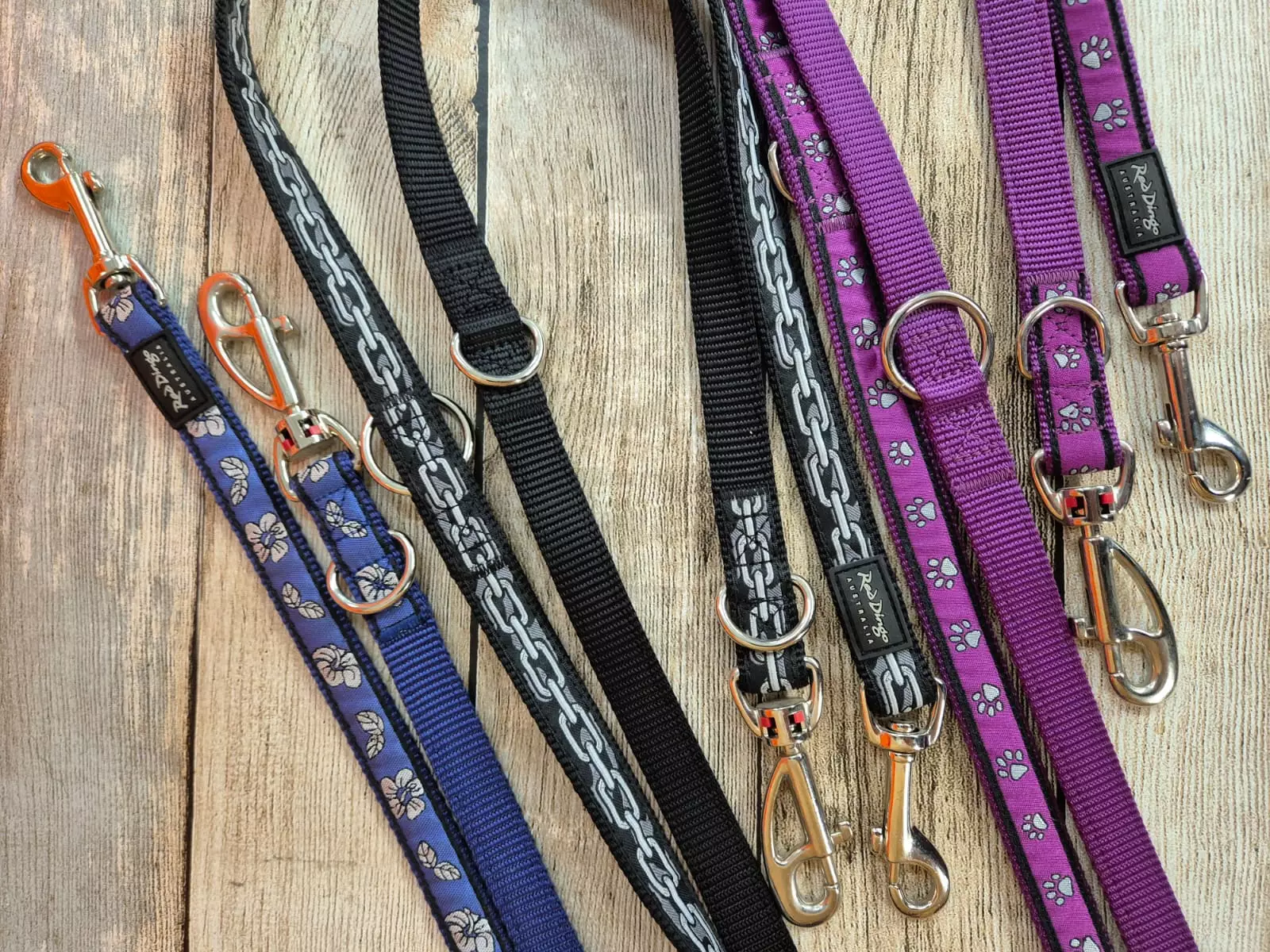 Träningskoppel med lås i båda ändar för att justera längden på kopplet. Kopplets totala längd är 1,8 m. Finns i olika färger/mönster.