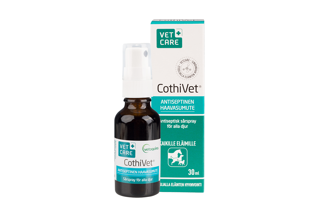 Cothivet® är en antiseptisk sårlösning för desinfektion av sår och andra hudskador hos djur. Innehåller växtextrakt, inga antibiotika. Den aromatiska doften förhindrar att djuret slickar på såret och avskräcker flugor från sårområdet. Användning: Rengör först det smutsiga såret med vatten. Spraya Cothivet direkt på såret 3-4 gånger om dagen tills såret har läkt. På samma sätt behandlas hästsår. Cothivet kan också användas som omslag, till exempel på en hästs ben. Fukta ren kompress med Cothivet och fäst den med ett bandage över såret. Innehåll: Hydrokolloid-extrakt 89,5 %, lavendelolja 5,8 %, rosmarinolja 1,5 %, kastanjextrakt 1,2 %, timjanolja 0,9 %, cypressolja 0,8 %, mailaolja 0,16 %, asternextrakt 0,14 %. Basämnet är alkohol, så produkten kan svida på ett öppet sår. Cothivet innehåller ingen tryckgas. Sprayen är jämn och flaskan visslar inte. Cothivet är ekonomisk: en 30 ml flaska räcker till att spraya cirka en kvadratmeter yta.