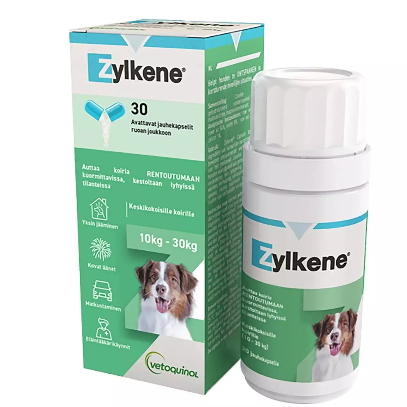 Ett naturligt avslappnande preparat för oroliga hundar (över 10 kg). Lämplig att använda vid exempelvis förändringar i miljön eller dagsrutiner, ensamhet, under åsk- och fyrverkeritider samt vid allmän nervositet. Produkten är baserad på enzymbehandlad mjölk från kor och utnyttjar mjökens lugnande och sömnfrämjande effekter. Utan konserveringsmedel, laktosfri. Kompletterande foder. Zylkene 225 mg: för hundar 10-20 kg, 1 kapsel per dag; för hundar 20-40 kg, 2 kapslar per dag. Kapseln kan ges hel, men det rekommenderas att öppna kapseln och blanda pulvret med maten, exempelvis i en ost- eller tonfiskbit. Dagsdosen ska ges som en engångsdos. I enstaka situationer (veterinärbesök, fester) ges Zylkene 1 timme före händelsen. Vid kortvarig stress är det bra att påbörja behandlingen 1-3 dagar före den stressiga situationen. Vid upprepade situationer kan Zylkene-kuren vara 1-2 månader. Vid långvarig användning enligt veterinärens anvisningar. 1 kapsel innehåller: trypsin-hydrolyserad nötkreatur kasein 225 mg, maltodextrin, magnesiumstearat. Näringsinnehåll: råprotein 72,0%, råfett 1,0%, aska 14,0%, fiber 0%. Sammanställningen kan förändras. Kontrollera den slutliga ingredienslistan på förpackningen.
