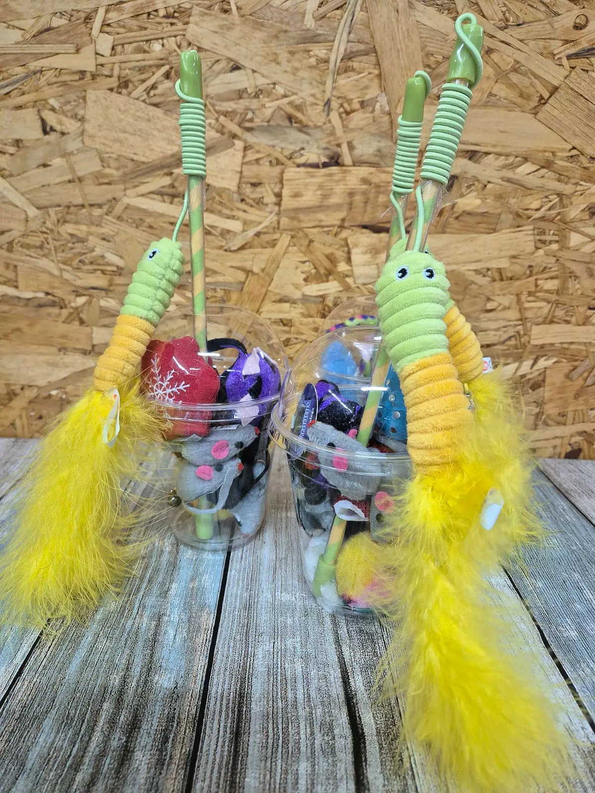 Lelumuki som innehåller flera olika leksaker, inklusive leksaksmus, boll och vift. Varje kopp innehåller cirka 9 leksaker + vift. Leksakernas form och färg varierar.Du kan ge hela koppen till katten först att leka med, och glädjen spricker ut när katten får upp den. Vi rekommenderar att spraya lite katnip i koppen för att få extra stimulans.